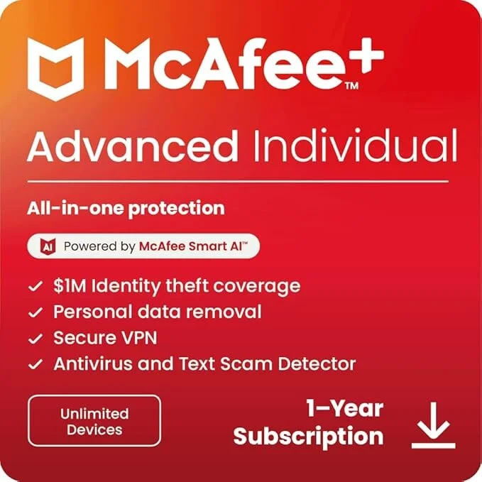 • Get peace of mind with restoration services and identity theft coverage up to $1 million. • Keep an eye on your credit score and receive notifications of any notable changes that might point to fraud. • Use our transaction monitoring feature to safeguard financial transactions. Extra Features • Stops the sale of your data by identifying and scanning your personal information online and assisting you in removing it. • Social media privacy settings are simple to modify to reduce data exposure. • Locates unused internet accounts connected to your personal data and assists you in deleting them. • Uses an unlimited Secure VPN to protect your online privacy and encrypts your internet connection for safe browsing. With a variety of cutting-edge security capabilities, McAfee+ Advanced Individual offers comprehensive protection for your digital life, protecting your devices, online activities, and personal data.